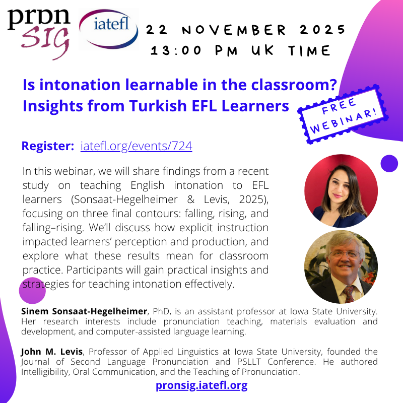 IATEFL Pronunciation Special Interest Group (PronSIG) invites you to a webinar with Sinem Sonsaat Hegelheimer and John Levis entitled: Is intonation learnable in the classroom? Insights from Turkish EFL Learners! The webinar will take place on Saturday, 22 November 2025 at 13:00 pm UK time.