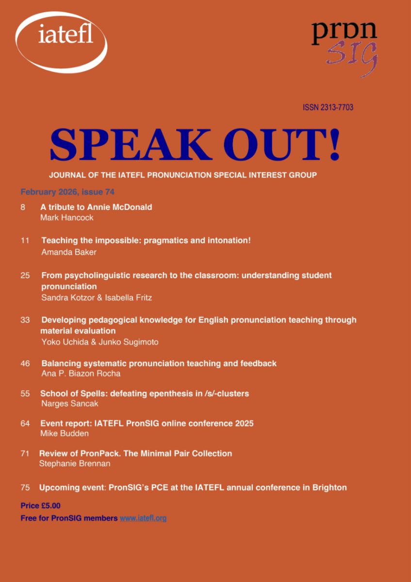 It is free for PronSIG members, who can access it by logging into the IATEFL website (My Resources → SIG Resources). Non-members can take a look at recent contents below from back issues. Contact Eleanor Baynham at Head Office to buy full issues (£5 each + p&p): Click here to request Speak Out! Journal issues.